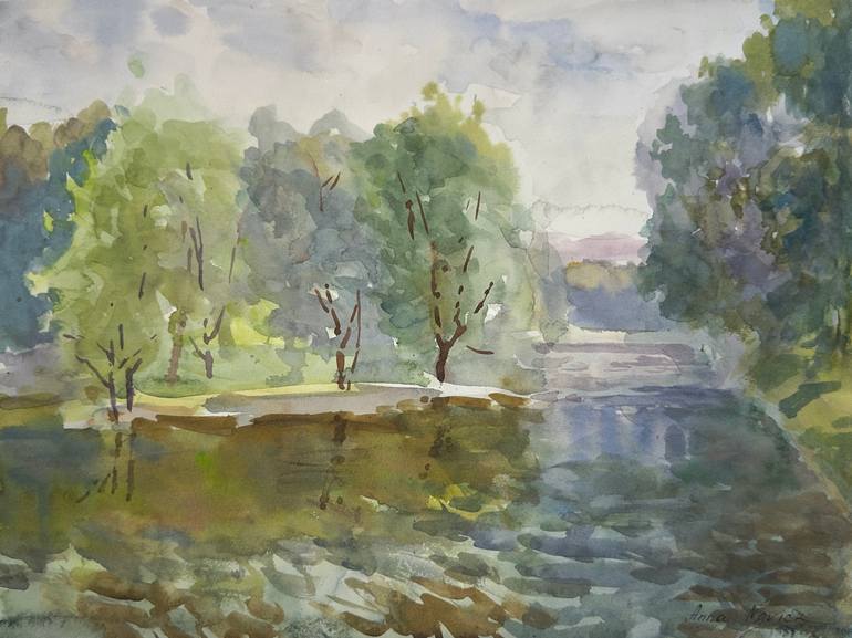 The Landscape "By the Waterfront" effortlessly envelops the viewer in a serene and reflective journey through delicate hues and moments of stillness. It was amidst the gentle whisper of the breezes and the soft, caressing light of a cloud-muted sun that this scene was painted in plein air. The inh...