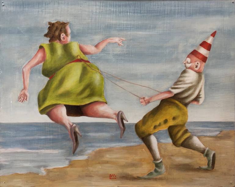 The Harlekine makes a joke fly. And at the same time he looks behind a woman She flies away and he tries to hold on...Many thoughts on the topic of farewell