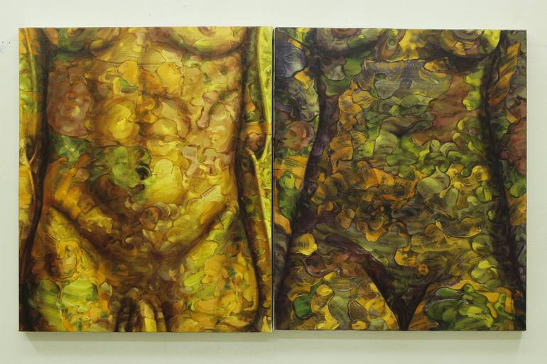 Inspired on the human body, an exploration of textures from the guaba tree on the surface of the human body. Investigation of sexuality and color.