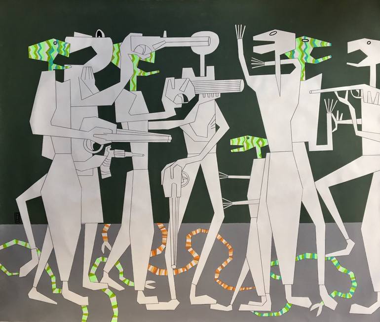 acrylic painting on the canvas inspired by african, mexican and contemporary art directions in blue and red tones. CANVAS 179 express white figures with guns, the painting is inspired by Picasso's artwork Massacre in Korea. Whole painting made in simple gray tones. I use high quality and bright colo...
