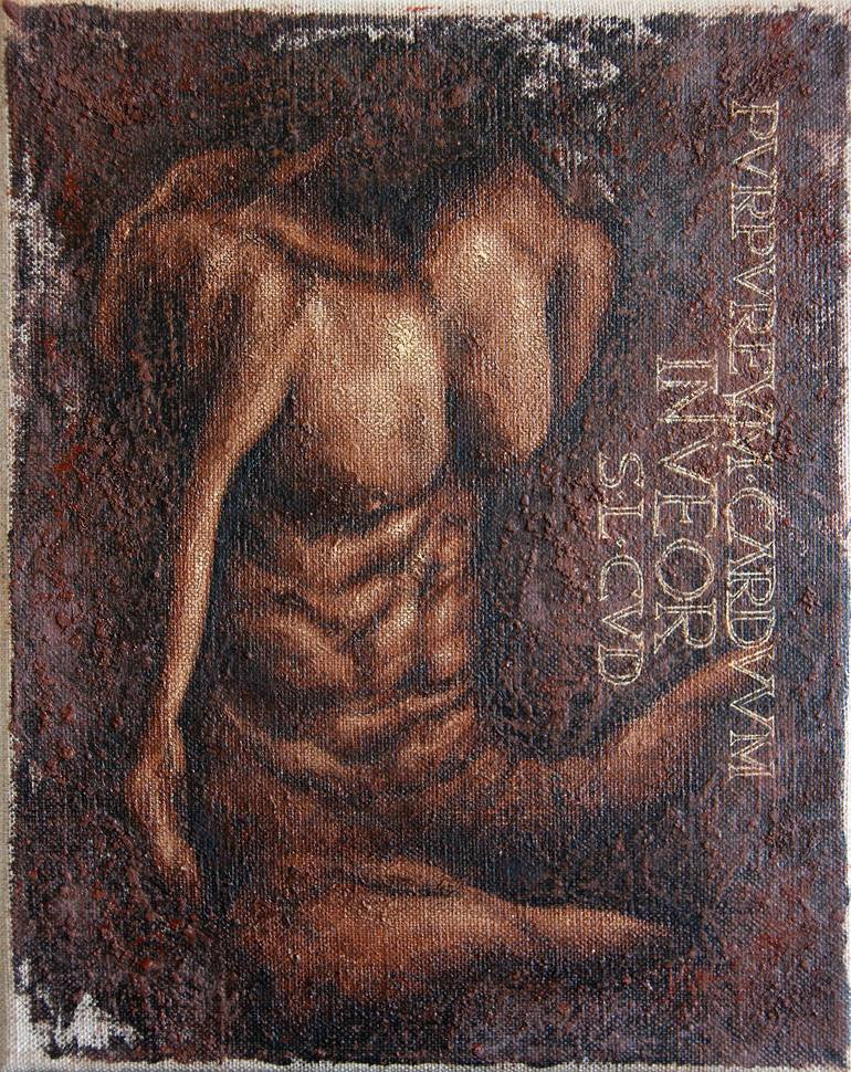 The painting (part of a series of four, acrylic and metal minerals on linen) represents the following original poetry, unique to the piece, interacting with the figure in classical Latin lettering: "Amongst the ruins I observe A thistle of purple and thorns Generated by the sorrows of the earth B...