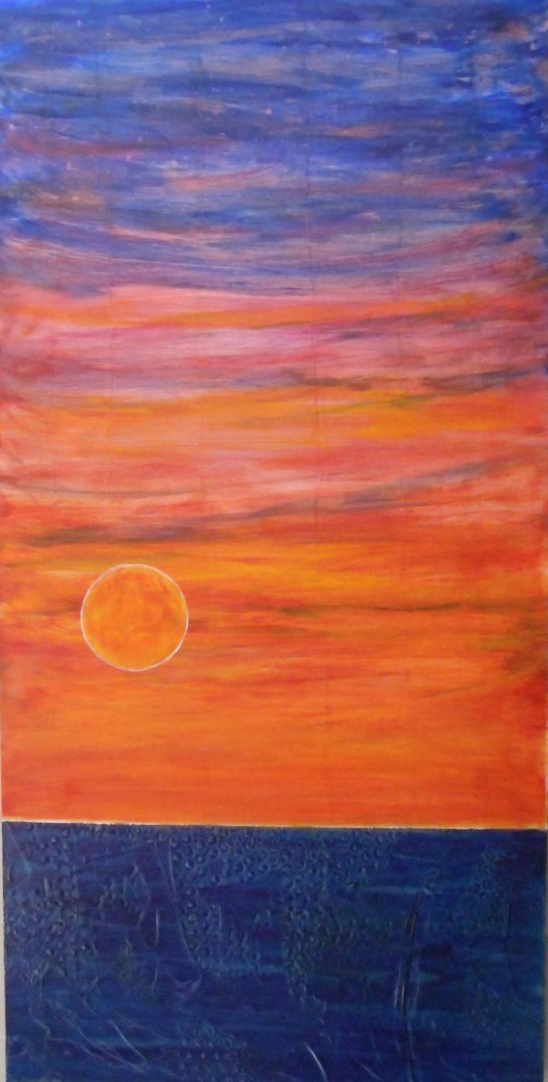 A Carolina sunset inspired this acrylic on wood panel piece. The top of the image with sky & moon are flat. The blue water at the bottom is highly textured for a more dramatic look.
