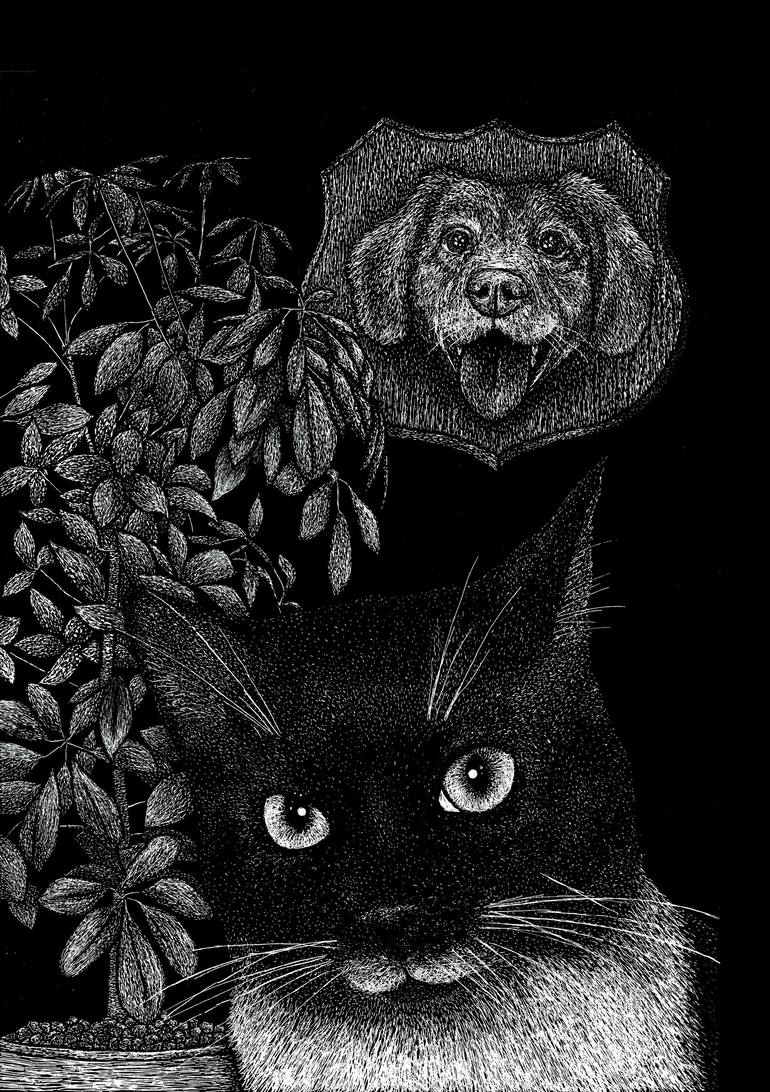 Cat lover or Dog lover? This will be an endless battle... Me? I chose my side! :) Technique: scratchboard It was a very slow and meticulous job because every single mark was made with a pin with which I engraved the black paint on a transparent plastic sheet. The artwork will be shipped with its...