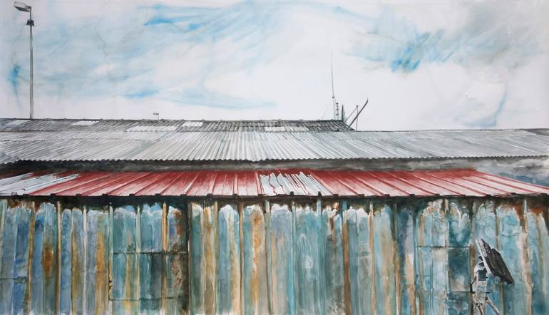 superimposition of hangar roofs forming an amazing graphic frame... and colors of rust and steel mixed