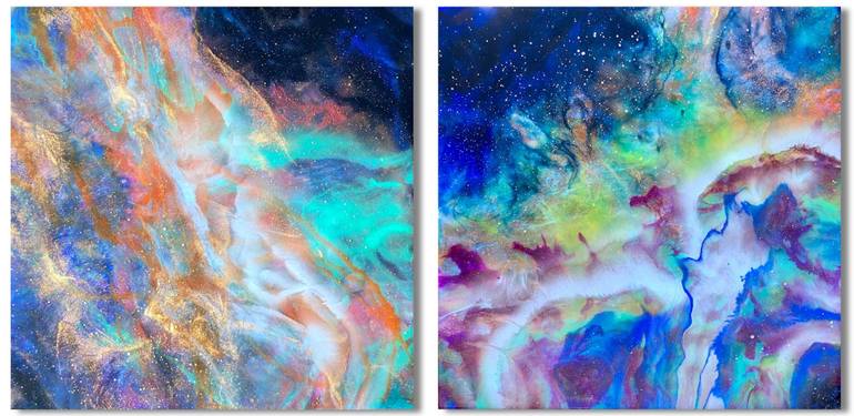 CETI ARCLON NEBULA is a two-panel painting that Tiffani made using her iconic holographic resin layering painting technique. You can peer through the layers getting a depth that lets you day dream into the starry spaces and wonder about what exploration awaits us there. The nebulaic images coming ou...
