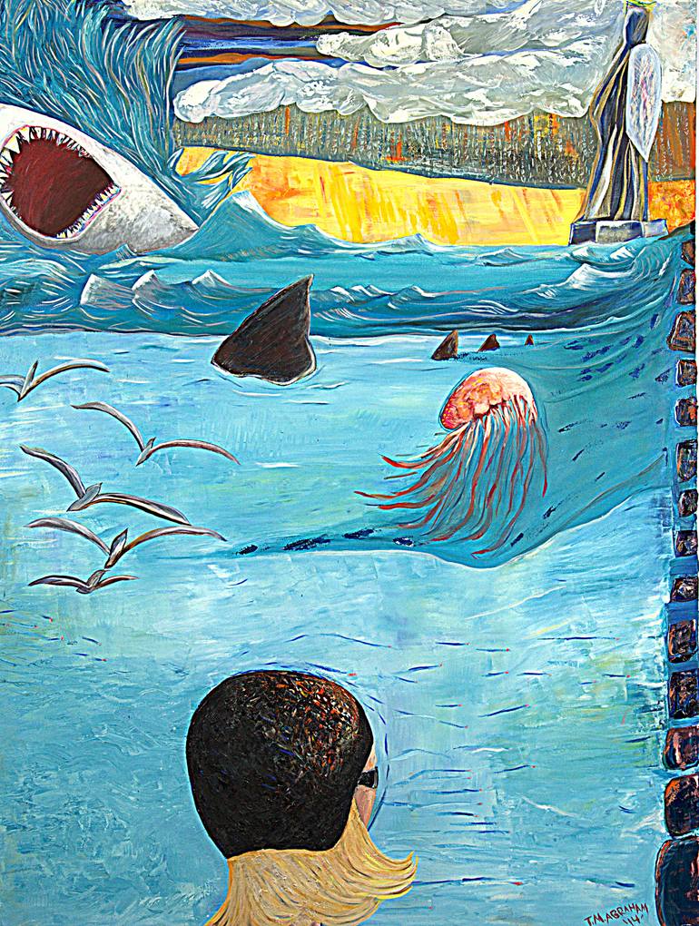 This painting represents the challenges that need to be conquered to reach the final destination. The statuesque angel represents fulfillment and accomplishment at the end of the journey. The swimmer is contemplating the right route to reach the promised prize of enlightenment.