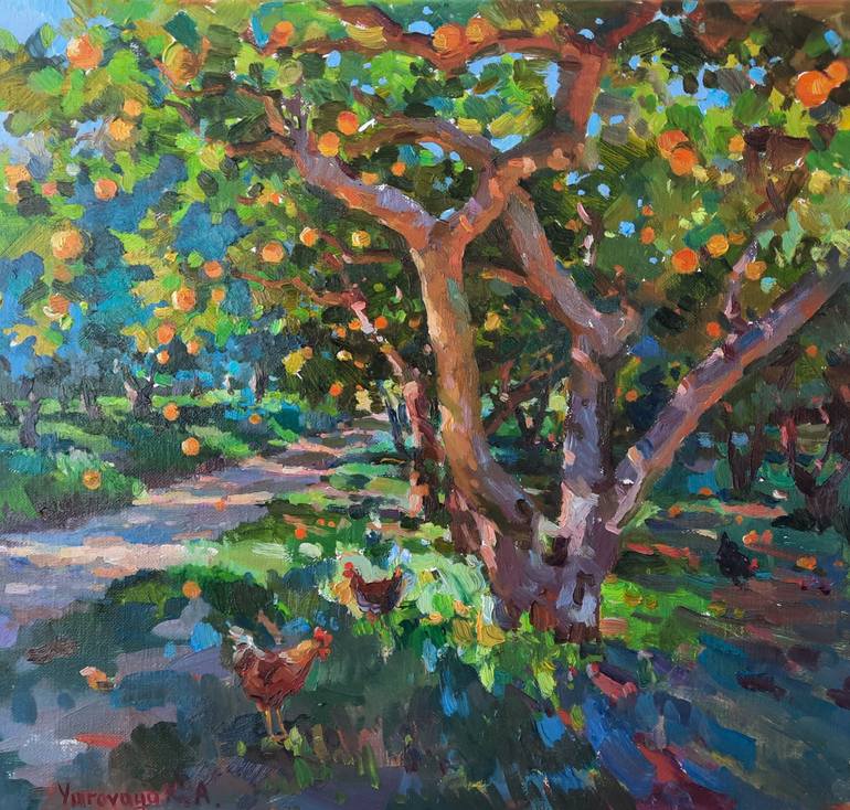 In this garden, I felt and observed the real abundance of nature! Branches of trees lavishly decorated with ripe oranges, dense green leaves, an incredibly rich palette of shades that played with the rays of the golden Greek sun and, of course, many motley chickens walking around, who watched my pro...