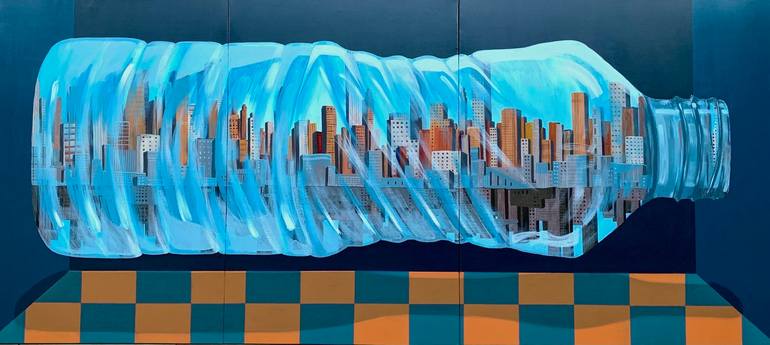 Description: The painting depicts a metaphorical image: a modern city with skyscrapers "locked" in a transparent plastic bottle - a familiar object symbolizing plastic pollution in the modern world. The twists of the bottle are like invisible chains, confining urban development in a limited space. ...