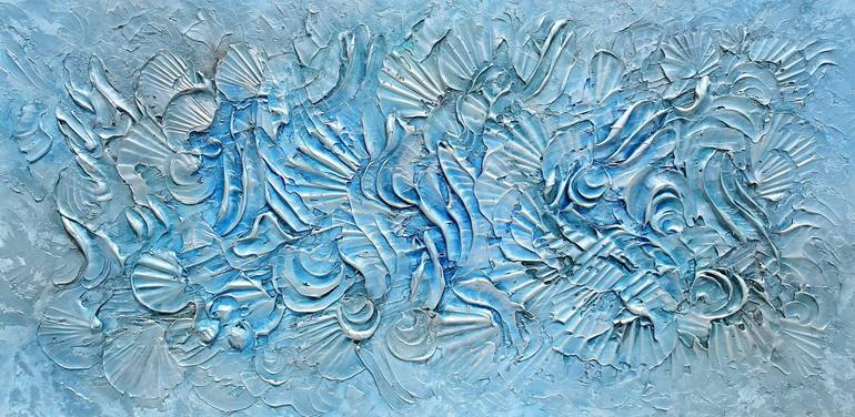 Abstract painting with coastal elements, flowing brushstrokes, and heavy texture in shades of blue, gray, teal, aqua, champagne, and silver creates a mesmerizing visual experience. Shapes and patterns of fossilized sea shells add a unique touch, infusing the artwork with a sense of history and natur...