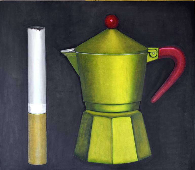“COFFEE AND CIGARETTE 2” , 2018 COLLECTION: coffee-pots MEDIUM AND SUPPORT: Original oil and acrylics colors painting on 100% cotton canvas. DIMENSIONS: 90 cm x 80 cm x 2 cm This original and unique artwork was created by me and signed on the reverse. This painting includes a Certificate of Authe...