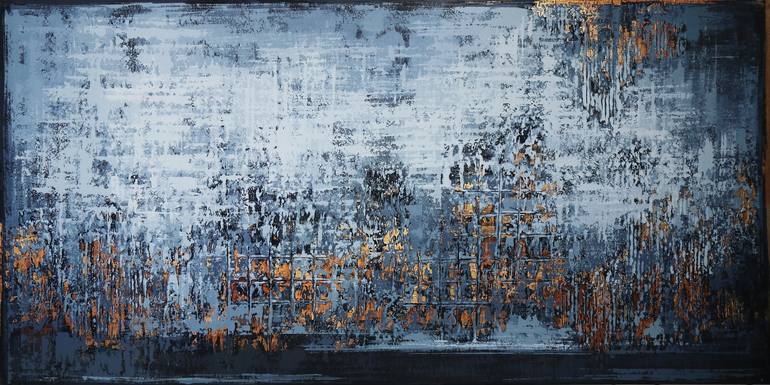 Main Colors: Blue Grey, gold, rust Canvas on an extra heavy, 4 cms thick wooden stretcher frame for a sculptural effect of the painting. The fascination of this painting lies in the detail. Structures, cracks, scratches, several layers of paint and a matte finish conserve the beauty of the transie...