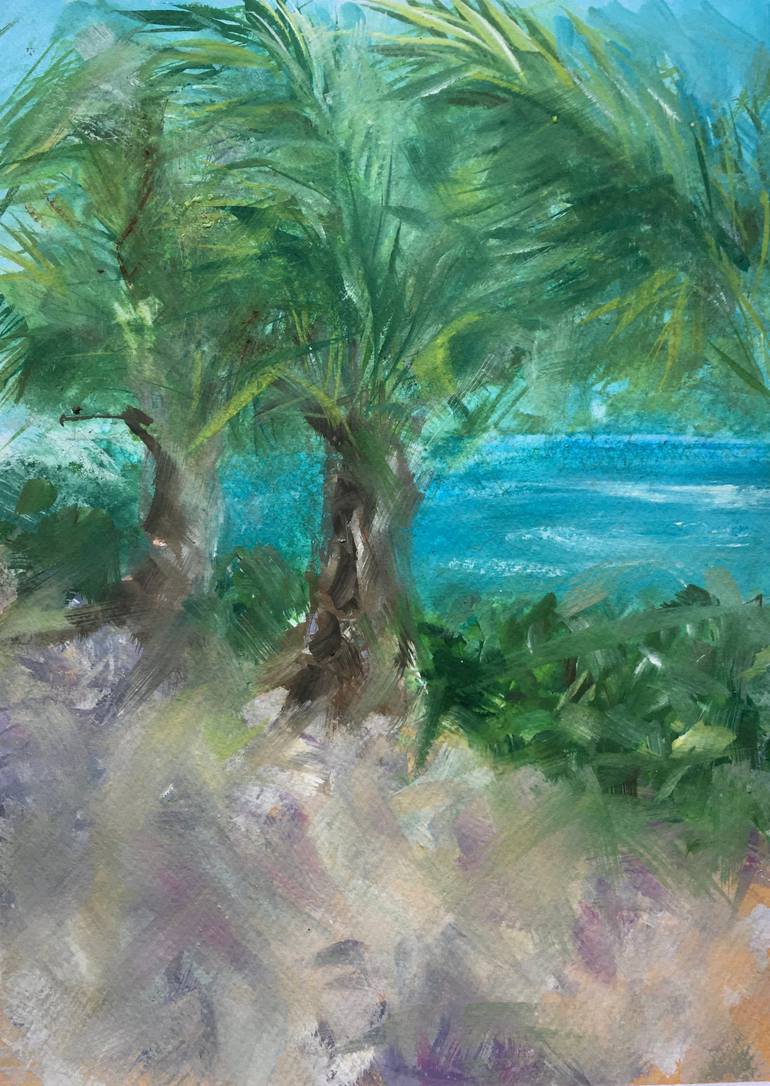 Impressionist gouache painting inspired by the beautiful nature in Costa Maya. Absolutely crystal turquoise water with rows of white foamy waves, gorgeous palms and long shadows on white sand impressed me so much that I decided to portray my emotions through painting.