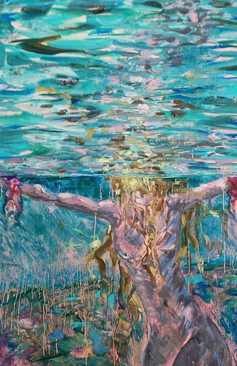 Qualcuno l’ha ancorata laggiù, povera sirena, abituata a scivolare come un fulmine nelle sue confortevoli e familiari acque: non è più libera di esprimere la sua essenza, le alghe l’hanno sovrastata, imprigionata, rendendola, un unicum con l’ambiente circostante. La sua fluente chioma è l’estensione...