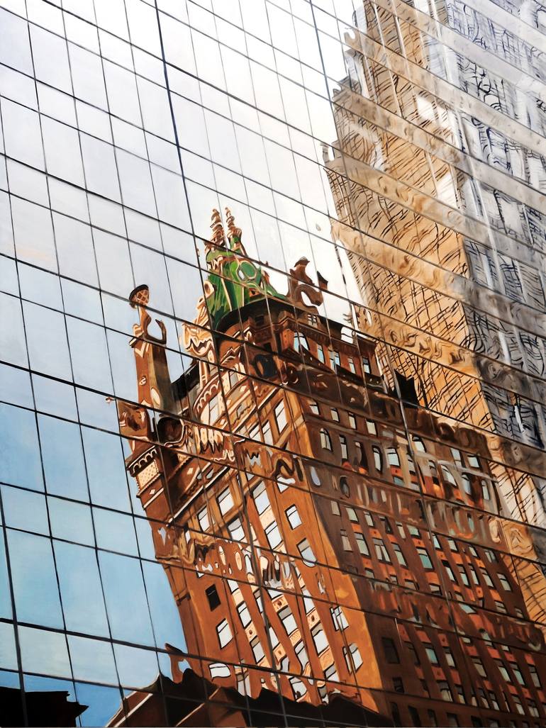 This dramatic rendering of the iconic "Crown" building in NYC, reflected on the facade of 9 West 57th Street involves the viewer in the abstracted intricate details. A romantic and nostalgic blend of classic and modern, and a great addition to lovers of NY architecture.