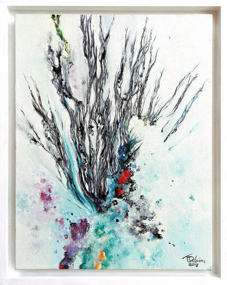 Theophile DELAINE is born in 1969 in Champagne. From his earliest childhood, his parents drove him around in Volkswagen minibus ; Greece, northern Africa, Afghanistan and Nepal, which marked him with a permanent desire for escape and freedom. At the age of 19, he went to Paris to study music at the University of Paris VIII and the conservatory. He already liked to draw but he discovered then the world of plastic arts and contemporary art of the capital. He then started to follow the curriculum Arts Plastiques at the university, visiting museums of Europe and elsewhere, galleries, exhibitions, sculpture on earth, on wood, collages, watercolor, chalk and many other supports. He will make many very enriching encounters. During all these years of learning, he nevertheless remained faithful to his double bass, following a classical formation and playing in jazz clubs. He will gradually end up abandoning music for brushes. At 23, he finally embarks on painting, working on technique, composition, harmony of colors ... At 26 he leaves to live in Crete where he enjoys drawing portraits of the mountaineers in the Kafénion. Throughout this time, he seeks to graphically express the need for freedom that characterizes him. Although he appreciates the expressiveness of Paul Rebeyrolles and the great sensitivity of Van Gogh, Zao Wou Ki's painting will ultimately be revealing. From there, at about 28 years, the pictorial adventure really begins. At 30 years old, he settles in Limousin, sets up a small workshop and paints - a lot, non-stop! He begins to sell paintings, takes up plastic art studies to perfect his theoretical knowledge and organizes his first solo exhibition. But it is not enough to paint to feel free, we must live it to paint it. Then, in 2004, he leaves again and expatriates to Madagascar where, for several years, his painting will flourish. He exposes very regularly in various places on the big island. At the age of 46, he leaves Madagascar for La Réunion where he exposes his pictorial reflections since the beginning of 2016