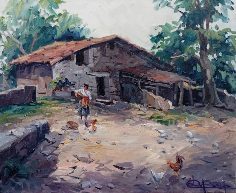Pintura al oleo sobre lienzo,pintada al aire libre,con gran contraste entre los colores rojizos del tejado,con los verdes de los arboles y los violetas en sombra de la cabaña,con los amarillos del cielo y del suelo en primer plano,creando un fuerte impacto visual de colores complementarios.