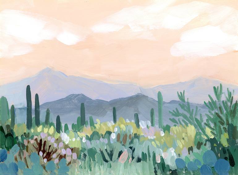 This artwork portrays a dreamy desert landscape under a peach-toned sky, with distant mountain ridges adding depth to the scene. In the foreground, cacti and desert plants appear fresh and vibrant, bringing a soft and lush feel to the landscape. The piece exudes a lovely, uplifting vibe, capturing t...