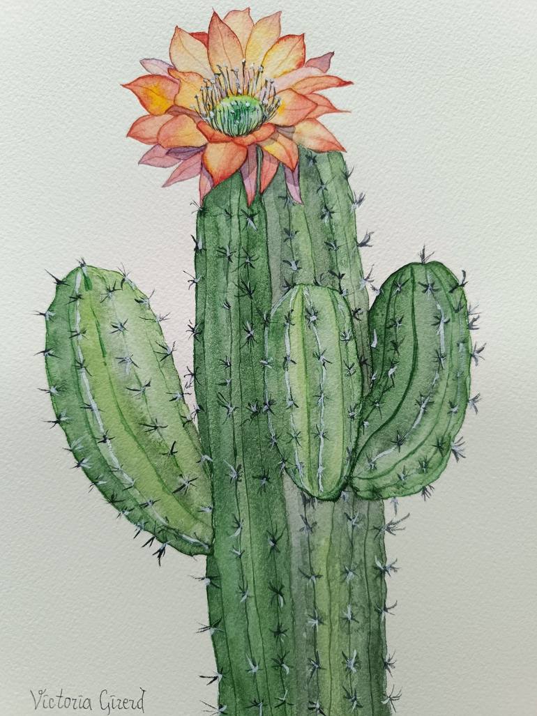 Watercolor painting of a desert cactus with a vibrant orange-pink flower. The cactus is depicted with careful attention to detail, showing the ribbed texture and numerous small spines. The colors are soft and blended, creating a sense of depth and atmosphere, with a light, neutral background. The...