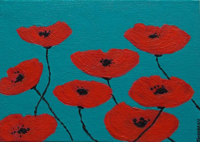 Study Painting Cadmium Red Poppies in alpine meadows, a turquoise blue background. Dust with a clean, soft cloth Artist Signature: Lower Right Sideways, THIBODEAU "Please contact curator@saatchiart.com for more details."