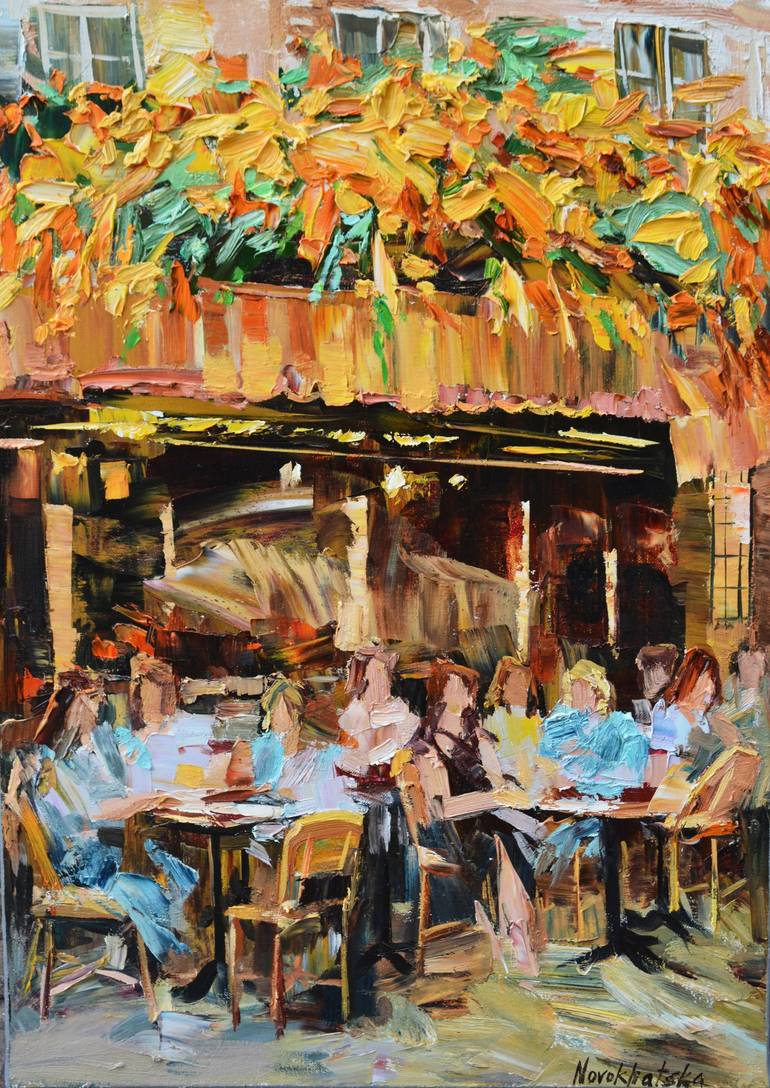 The subject of colorful Parisian cafe was a great inspiration for me, I pay particularly attention in this piece to the treatment of light, and the strong contrasts between the dark shadows and warm, golden light. I work in my personal expressionist style, creating a rich textures on the surface of ...