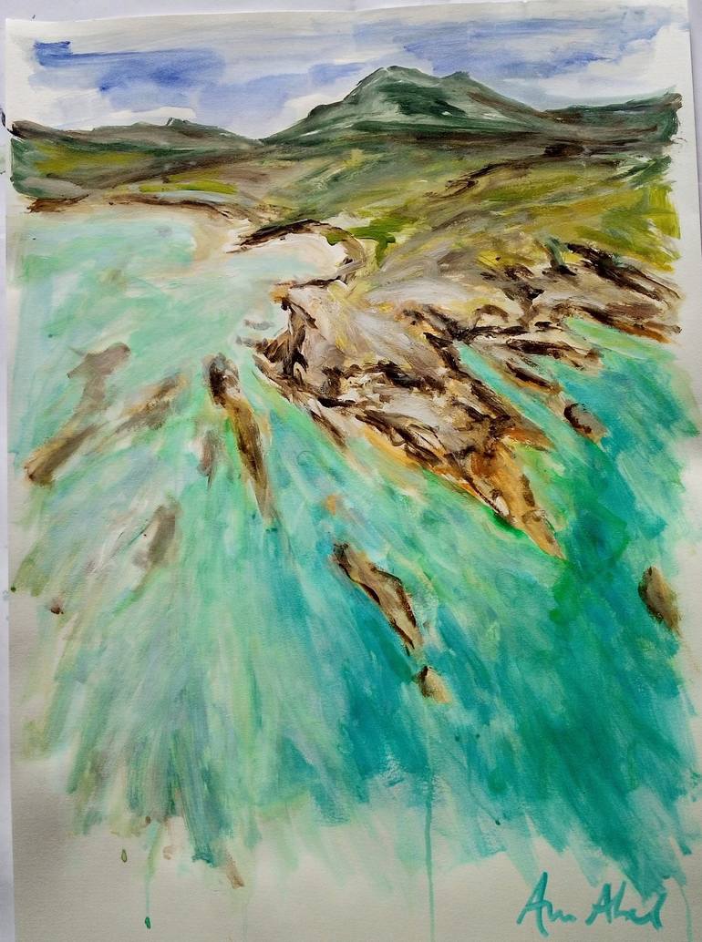 Impression light turquoise blue and emeraude for beach/stones in Sardaigna. Large plan of color as abstract / expressionism painting. Équilibre. Harmony. Immersion dans la couleur. Plénitude du rivage méditerranéen. Blue. Turquoise blue and green shades.