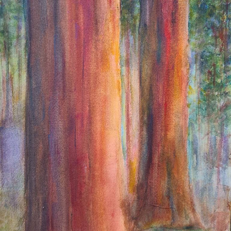 Watercolor painting that creates the feeling of being inside of a quiet redwood forest in California.