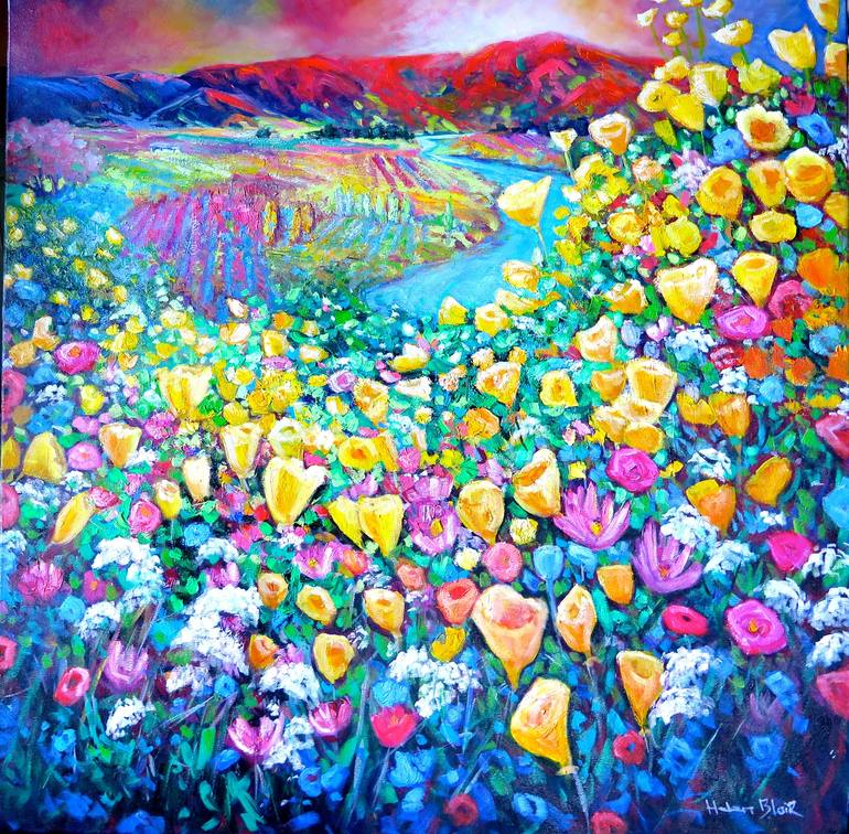I love the Califorian poppies and wildflowers we have growing here in Central Otago, it grows abundantly everywhere, the colour is so bright and cheerful. I wanted to incorporate other aspects of central otago into the same painting, orchards , vineyards, river and the Dunstan Range , so this is a d...