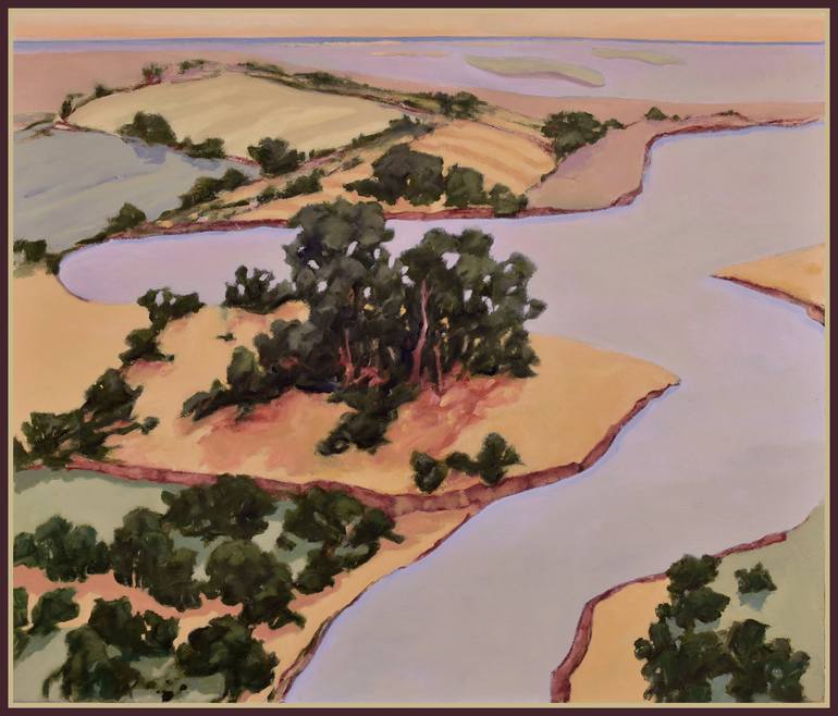"Californian Dreamscape." is a 36"x42" oil on gesso-prepped hardboard. The aerial perspective of 'Dreams' composition was suggested in a painting by Wayne Thiebaud. it captures a serene landscape with a meandering river, fields, woodlands, and a central cluster of trees. Pastel blues, yellows and gr...