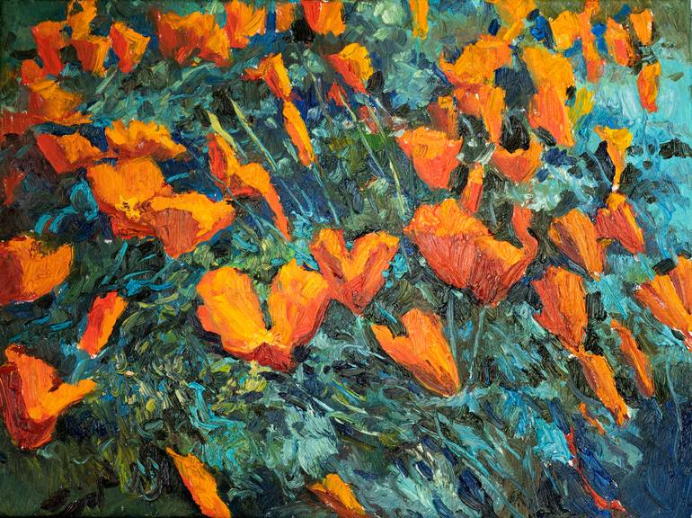 I painted this work in the mountains in California when local beautiful, orange poppies are in blossom! The artwork is on gallery wrapped Belgian, Oil-Primed Linen. The artwork is wired from behind and framing can be optional. If you have more questions, please feel free to ask! best, Suren