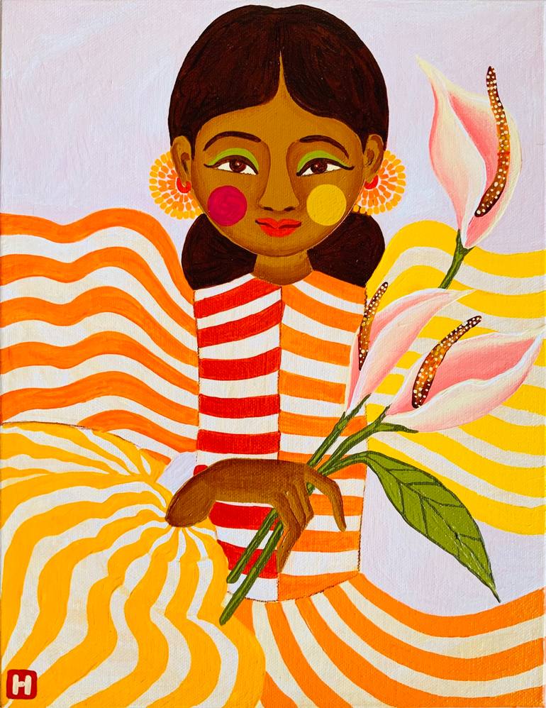 Hiranya is a classical figurative Painter based in Brisbane, Australia. She exclusively produces works derived from her cultural Heritage and personal history. Bold colours and symbolism are a focus point. She is currently showcasing three Collections on here: (i) REVIVAL OF THE NYMPH: An ode to the Nymphs found in the works of modern masters and bringing them to the now. (ii) FLORA'S SECRET: A Summer-floral themed series where the artist is breaking all the boundaries of colour and patterns with lots of details around the narrative female identity. (iii)TEA ROOM: A personal fascination. A series that stays within stripe patterns on the subject's outfit, starting from simpler-minimal stories to sophisticated tales with her personal favourites; colourful tea cups and tea pots, and all other details come with it. Each work takes its own significant time to finish based on the amount of details going in. The beauty of every aspect and little details of each work is extremely important to the artist. Hence they are carefully realised. Instagram: Huesbyhiranya Website: Huesbyhiranya