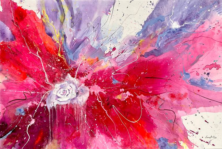 This joyful floral abstraction expends love and energy and is dedicated to love and relationships. Soaring beautiful strokes, stains and splashes on the canvas create a beautiful atmosphere. Acrylic and oil paints - quinacridone pink and red, purple, alizarin, some purple, lemon yellow and sky blue ...