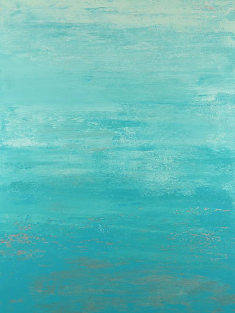 Calm Water is an original acrylic painting on canvas by Suzanne Vaughan in soothing aquatic teal greens. An abstract expressionist style painting with layers of thick paint applied with palette knives and other tools to create a textured surface. It captures the essence of the beach, the sand, sun a...