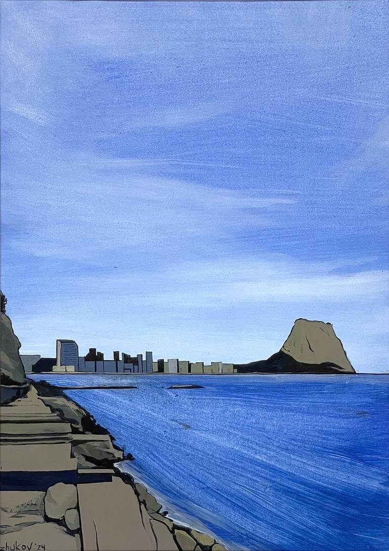 This painting depicts the promenade of the small town of Calpe, located in the province of Alicante, Spain. I once lived in this town for about 2-3 months and have many fond memories of it. The painting also features the Ifach mountain, which is a landmark of this town.