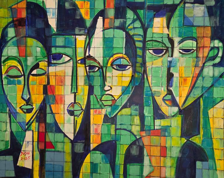 This original mixed media painting, "Camaraderie 2", offers a fresh take on figurative abstraction. Inspired by cubism and art deco styles, the artist uses acrylics to build a textured surface on canvas with paper and soft yarn. The result is a vibrant, colourful exploration of form and emotion. Th...