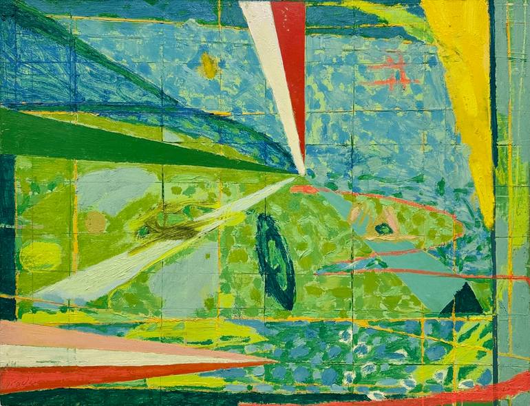 A window perspective of horizontal and vertical lines grid a pattern filled with brushstrokes and triangular rays. From the near foreground a broken orange line winds its way into the painting to converge with the rays at a distant focal point along an apparent ridge. Various features suggest a lan...