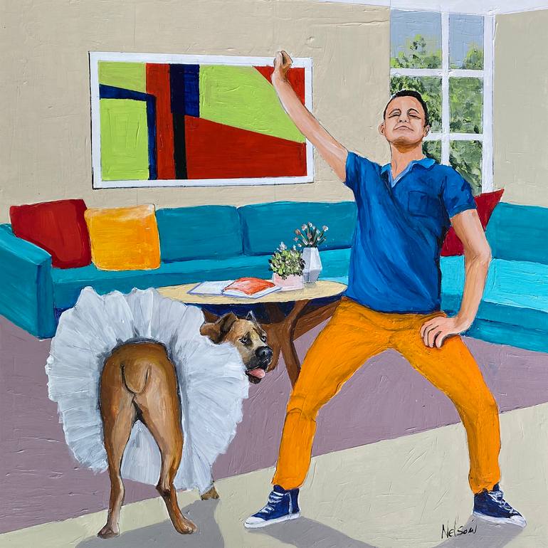 My series of People and their pets in a Palm Springs Mid Century setting. I paint the world I want to live in, colorful and full of love.