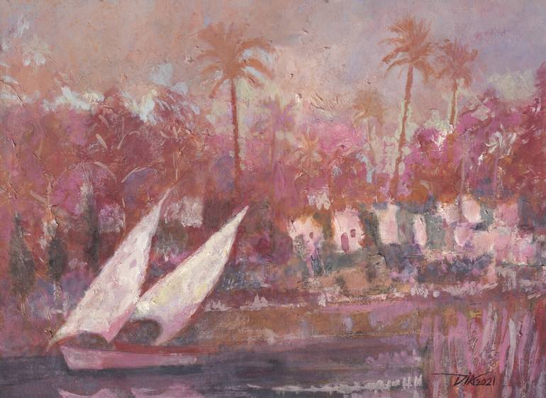 Boats sailing on the river This painting exploring the beauty of the Egyptian countryside, Inspired by, the Egyptian folklore and traditional popular culture. Explore the beauty of nature, color, movement and stillness