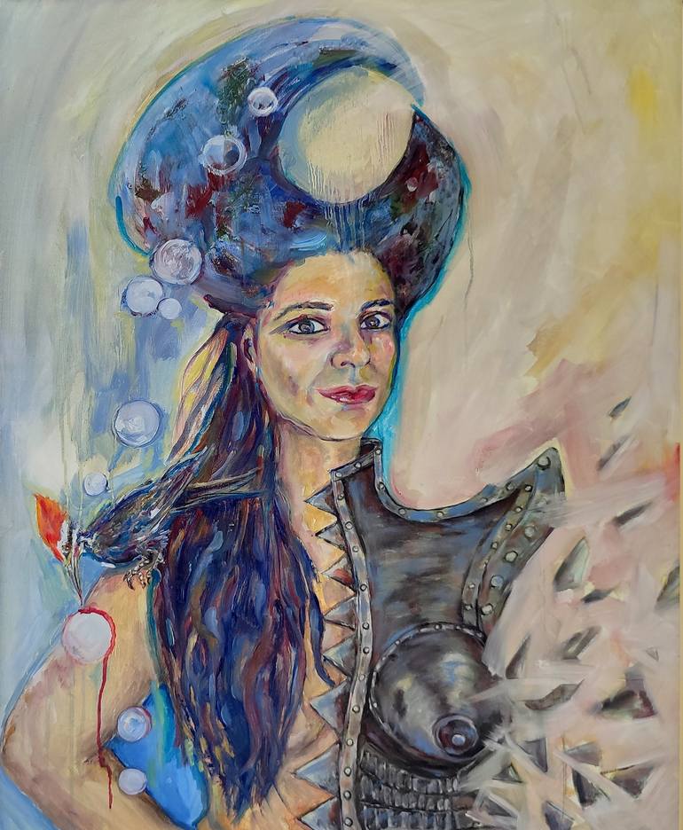 This image was inspired by women born under the sign of Cancer, as warriors who hide their sensuality and loveliness under a protective armor. Like all women who are characterized by courage and strength, this painting celebrates the power of all women because every woman is a warrior. Many elements...