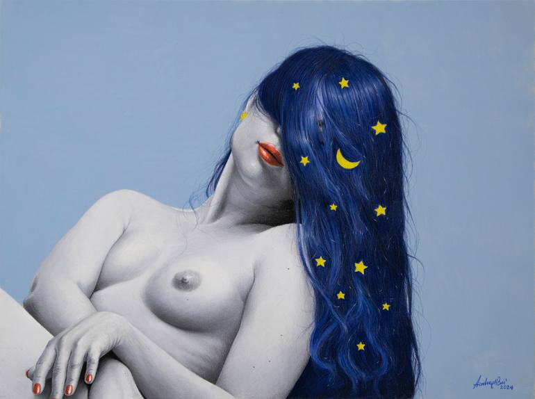 "Capelli stellati" is a painting born from the desire to explore the connection between our inner world and the immensity of the cosmos. The female figure, with her blue hair adorned with stars and a crescent moon, represents dreams, desires, and unspoken secrets. They symbolize everything we hold ...