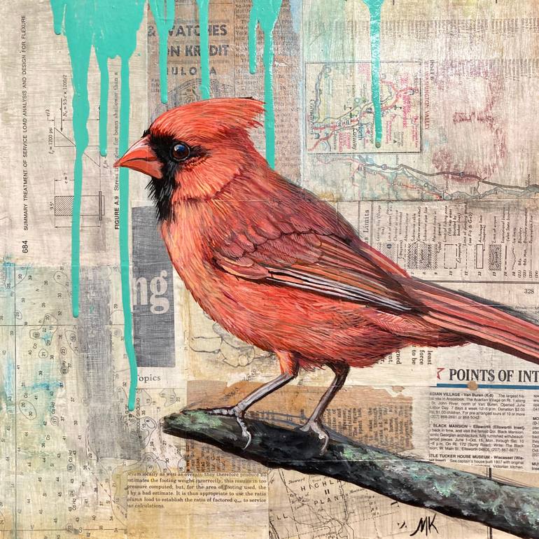 Cardinal on a background of vintage paper collage with found maps, book pages and paper ephemera. Blending contemporary collage mixed media with traditional Audubon style illustration. Edges are painted black, varnished, wired and ready to hang.