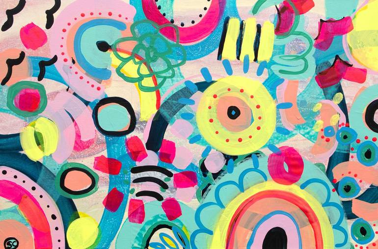 My artwork documents my ‘everyday noticings’ and explores these through my love of colour and an array of mediums such as collage, printmaking, painting, drawing and photography. The common starting point for my work is the close observation of my local landscape, taking the time to really see the patterns in nature, the colour of the ocean or a tiny bright flower bursting from a thick deep green hedgerow. I document theses colours, shapes and thoughts in sketchbooks and then process my ideas back in the studio. I may have a loose idea for a collection in mind but I soon find myself lost in the creative process itself and my work can then take more of an intuitive approach, responding to the last creative move as I go along. I find myself drawn to exploring juxtapositions, such as colour transparency versus opacity, thick and thin lines, energetic and soothing mark making, wet and dry paint applications. All these components help to portray my unique interpretation of my world onto canvas or paper. My art practice reflects who I am as a person; curious, colourful, playful and spontaneous.