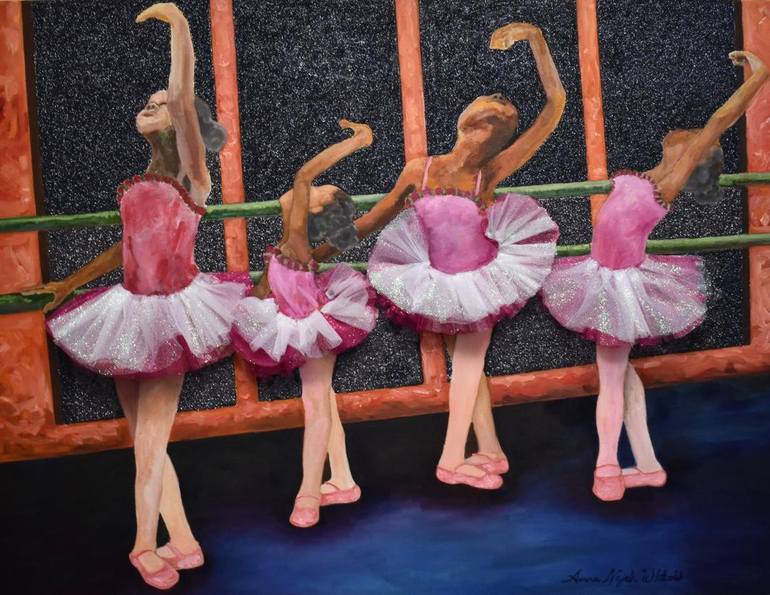 Inspired by my daughters when they were young, it was all about ballet. They would constantly practice and I would be up to my elbows in glitter and tulle. This is a mixed media painting created with oils, glitter and tulle.