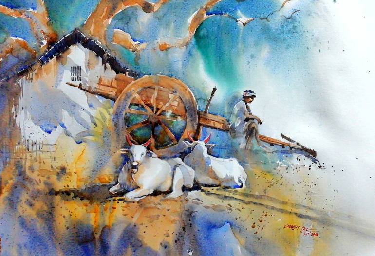 It is a watercolor painting on paper. It depicts a typical rural scene while bullocks of the cart do take rest after a long tiring day