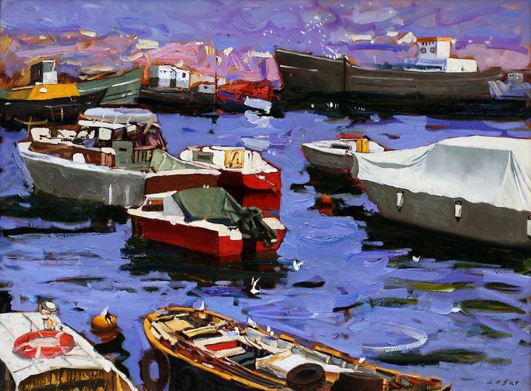 "Caspian Sea Boats" by Cesar Mammadov is an oil on canvas painting that captures the busy activity of a harbour on the Caspian Sea. The composition features a variety of boats, each painted in bold colours and detailed textures, reflecting the vibrant life of maritime commerce and travel. The water ...