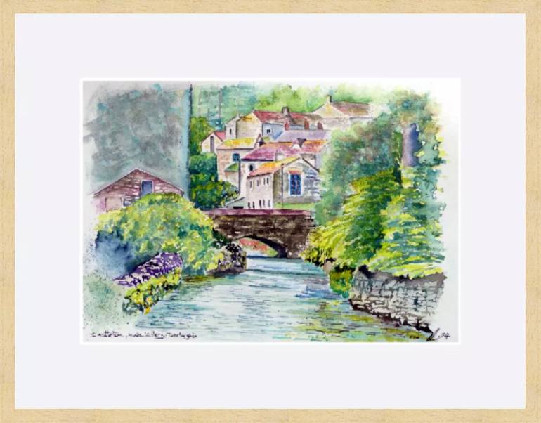This original watercolor captures the timeless charm of Castleton, where hillside cottages rise in rhythmic geometry above the steady arch of the old stone bridge. Warm ochres and reds of the rooftops soften into the cool greens and blues of the surrounding valley, creating a lyrical balance between...