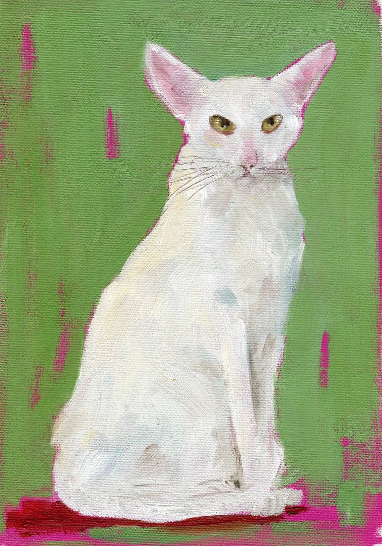 Immerse yourself in the world of natural beauty with an amazing oil painting! An elegant white cat with large pinkish ears stands out against an emerald green background, creating an image full of grace and charm. This cute cat seems to invite you into a world of calm and tranquility. His expressiv...