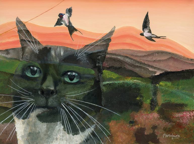 This black and white cat just turned up and adopted us as her new staff. She is very friendly and affectionate. I have imagined her reflected in the window glass, eyes locked on one of two birds flying outside. The original is painted using the strong colours achievable with acrylics. It is on a s...