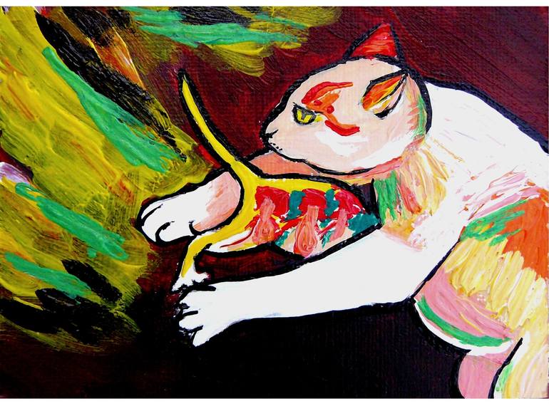 The painting is from a serie of 8 ACEO works based on cats subject . This is my cat enjoying one of her kittens . Her facial expressions showing different emotions , and the expressive body movement made a fascinating spectacle . So i took dozens of pictures and i used some of them to express the f...