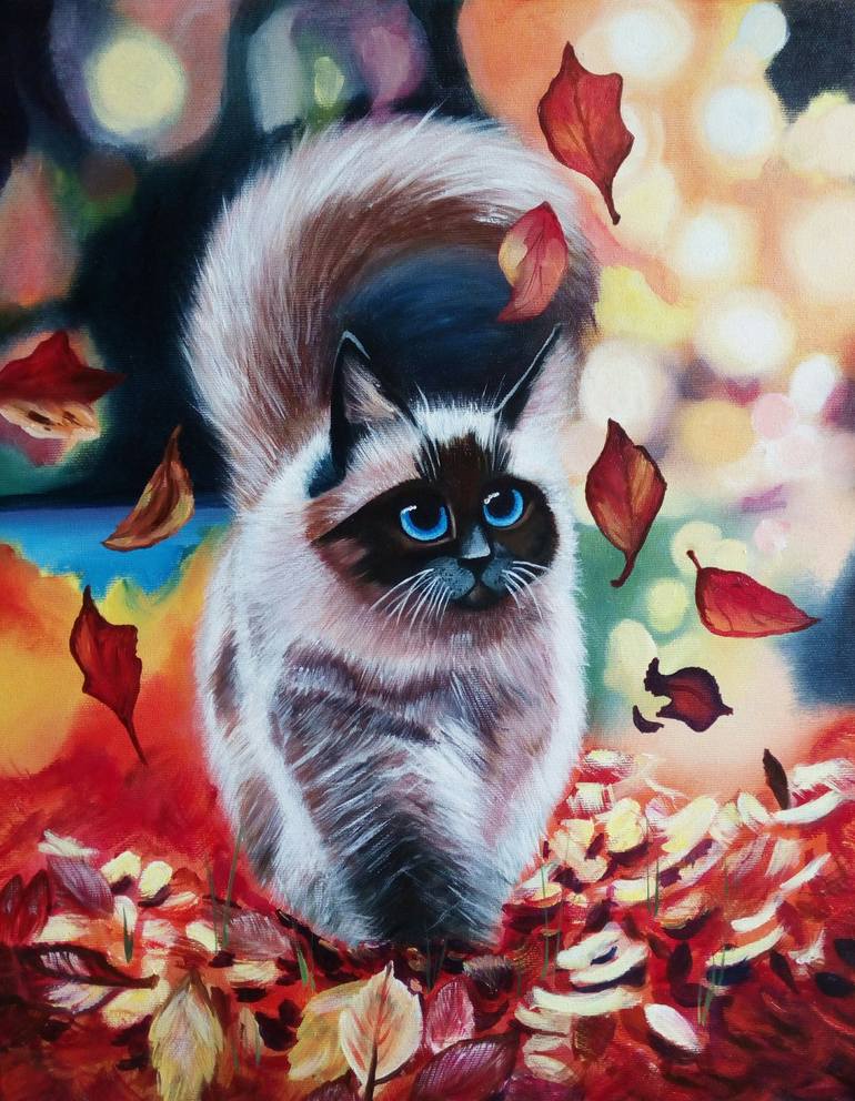 A beautiful kitty cat with blue eyes is running through the golden autumn leaves. He's running toward happiness! oil painting canvas The original painting, painted with high quality oil paints. Size: 40/50 cm Varnished, comes ready to hang edges are painted