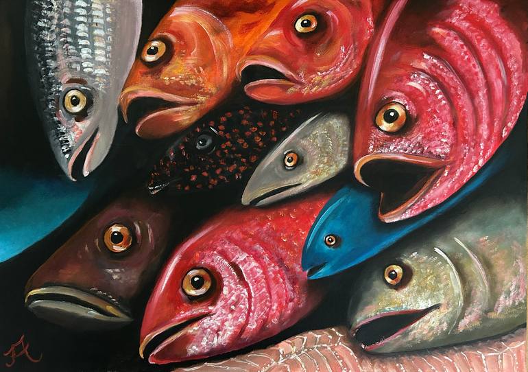 This is a larger version of the fish still life I did earlier this year. I saw some of those fish at Borough Market others are fantasy. I like their diverse skins and colors. The painting is on a stretcher frame ready for hanging.